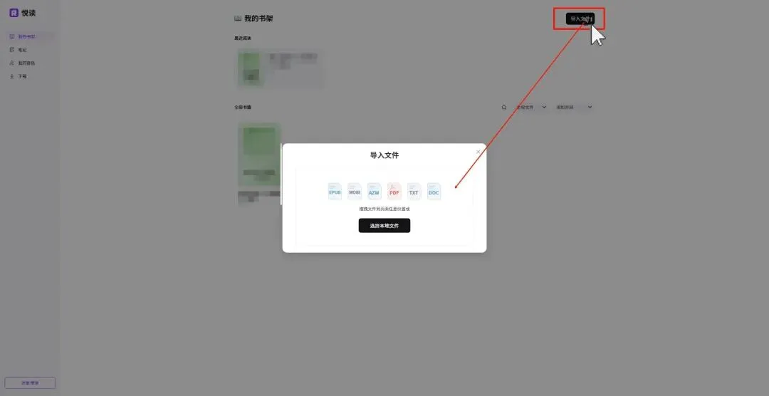 打开软件/网页端,手机端点击右下角的“+”号选择导入书籍的方式导入即可;而网页端,点击右上角“导入文件”按钮,随后拖动书籍到中间窗口即可。