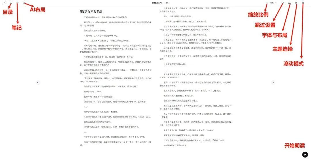 网页端:点击右下角的“开始朗读”按钮,即可进入听书页面,同时点击左下角左下角的“人物头像”,就能选择音色;