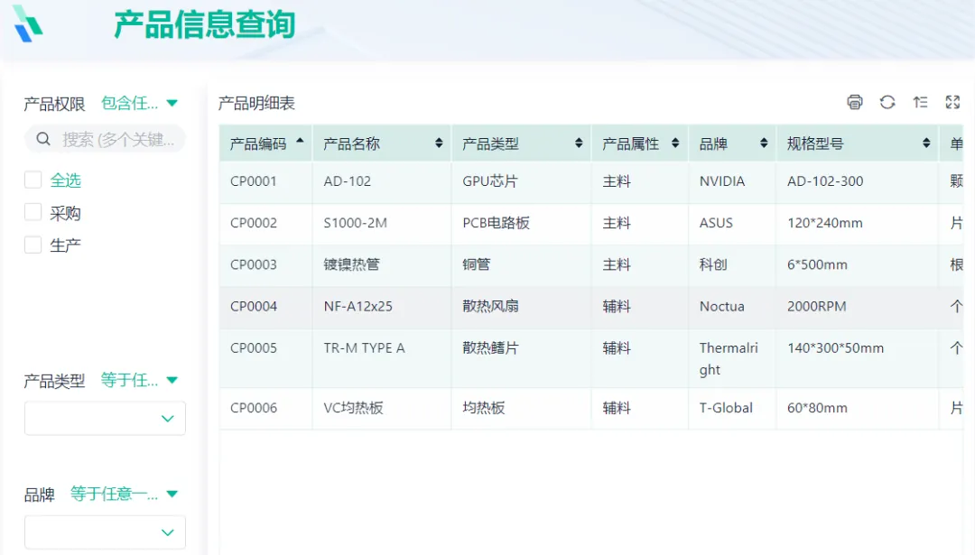 产品数据包括「产品信息」、「产品分类」两部分表单,用于记录所有产品相关信息,如产品编码、属性、类型、品牌等。「产品信息查询」仪表盘方便仓管人员快速寻找进出库产品,提高仓储效率。