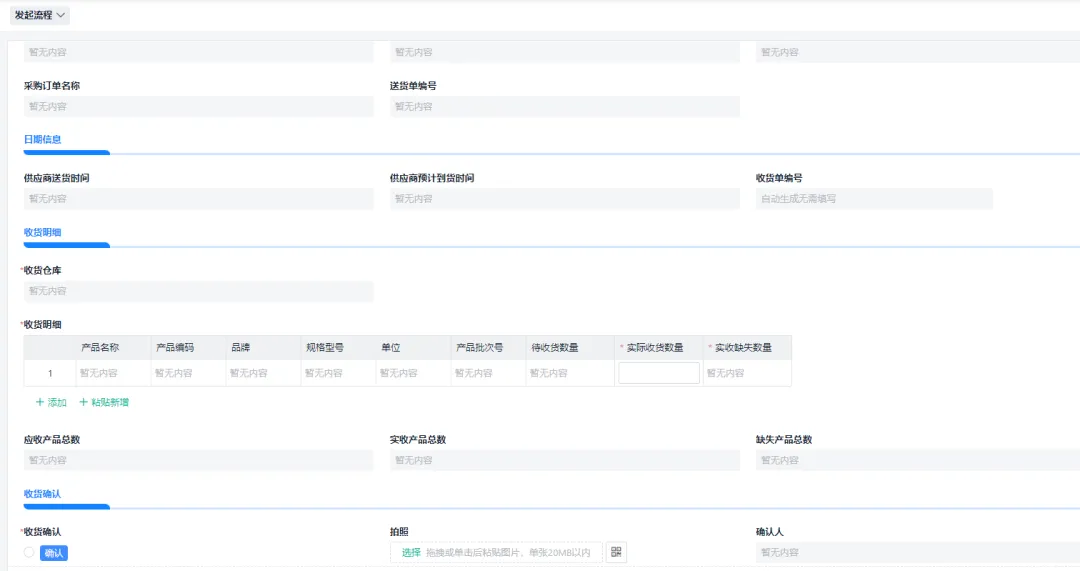当供应商来料到达仓库时,仓管人员根据采购订单信息,核对供应商送货单,确保所送货物与订单一致。核对无误后,仓管人员开始填报采购收货单,详细记录来料的名称、数量、规格等信息。此时,系统将自动触发采购收货子流程,确保后续操作能够顺利进行。