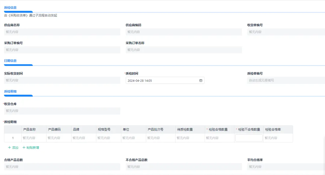 3)仓管进行收货确认,同时触发质检子流程,由质检员填写来料质检单;