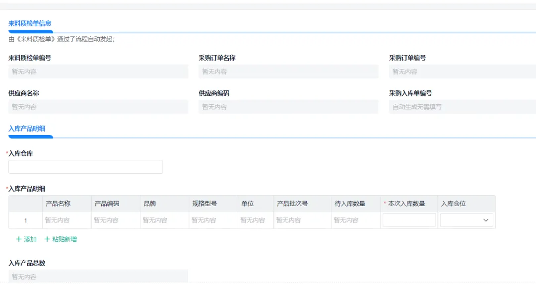 4)质检员进行质量核验,完成质检流程后触发采购入库子流程,由仓管填写采购入库单;