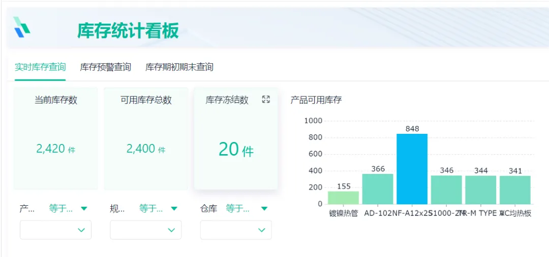 库存查询统计看板记录了当前库存总数、可用库存总数等汇总数据。同时,还展示了每件产品的实时库存明细,仓管可以根据产品名称、规则型号等筛选条件去查询具体的某件单品的实时库存数据。