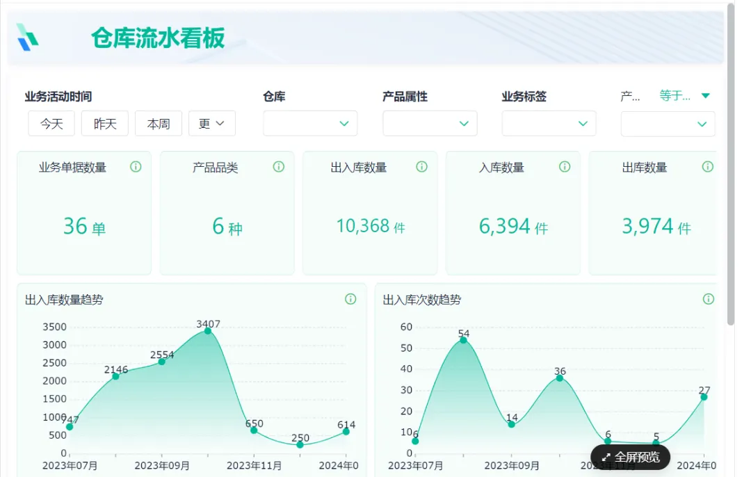 仓库流水看板主要用来展示和监控仓库出入库状况的信息面板。该看板通过图表、指标和数据等形式,直观地呈现仓库的货物进出情况,帮助企业更加高效地管理仓库。