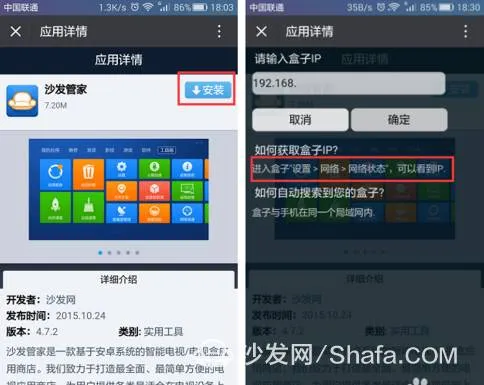 点击“安装”按钮之后,会跳转到如下界面。这个时候就需要在荣耀盒子的设置 – 网络 – 网络状态中查看一下你的盒子的IP,然后在手机界面输入,点击确认,等待应用自动安装。进入到荣耀盒子Pro“应用”菜单,就能看到一个“沙发管家”的图标了。