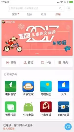 进入小米投屏神器主界面之后,我们可以看到最上面有“宝箱”、“视频”、“截屏”和“应用”四个选项,我们需要给小米盒子安装应用的话,就需要进入“应用”选项中进行了。