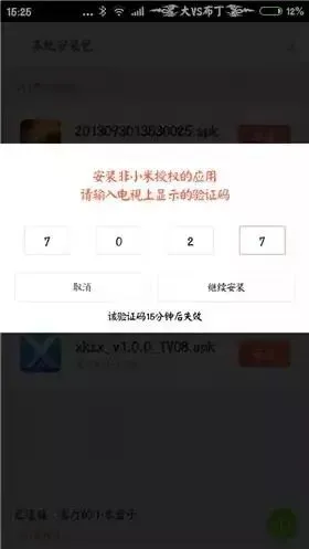 我们可以看到,如果安装的不是小米盒子应用商店中的软件的话,会有一个输入验证码的提示框出现哦,这时候电视屏幕上会出现一个投屏神器验证码。