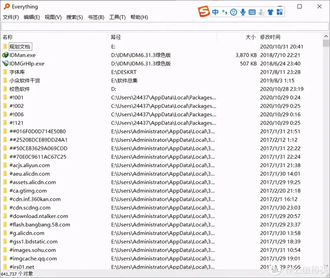 模糊搜索技巧:在 Everything 的修饰符技巧页面,提供了一个参数:path: / nopath: 匹配完整路径和文件名或仅文件名。在搜索前加修饰符。