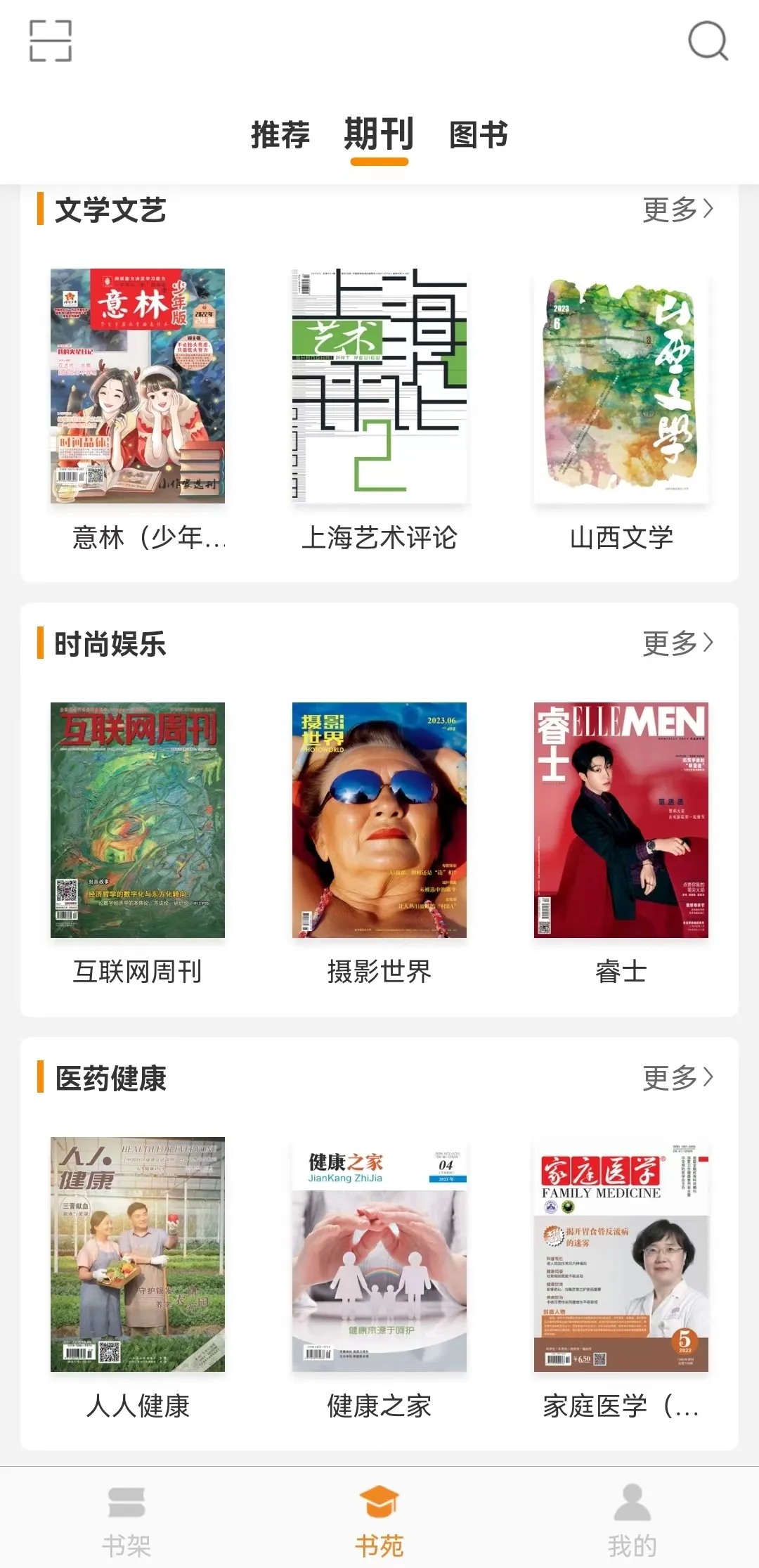 这款 APP 包含的杂志类型也非常多,有时政民生、党政军事、文学文艺、时尚娱乐、医药健康、科技科普等等。
