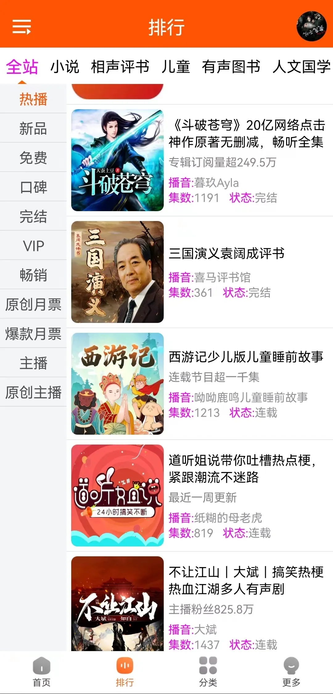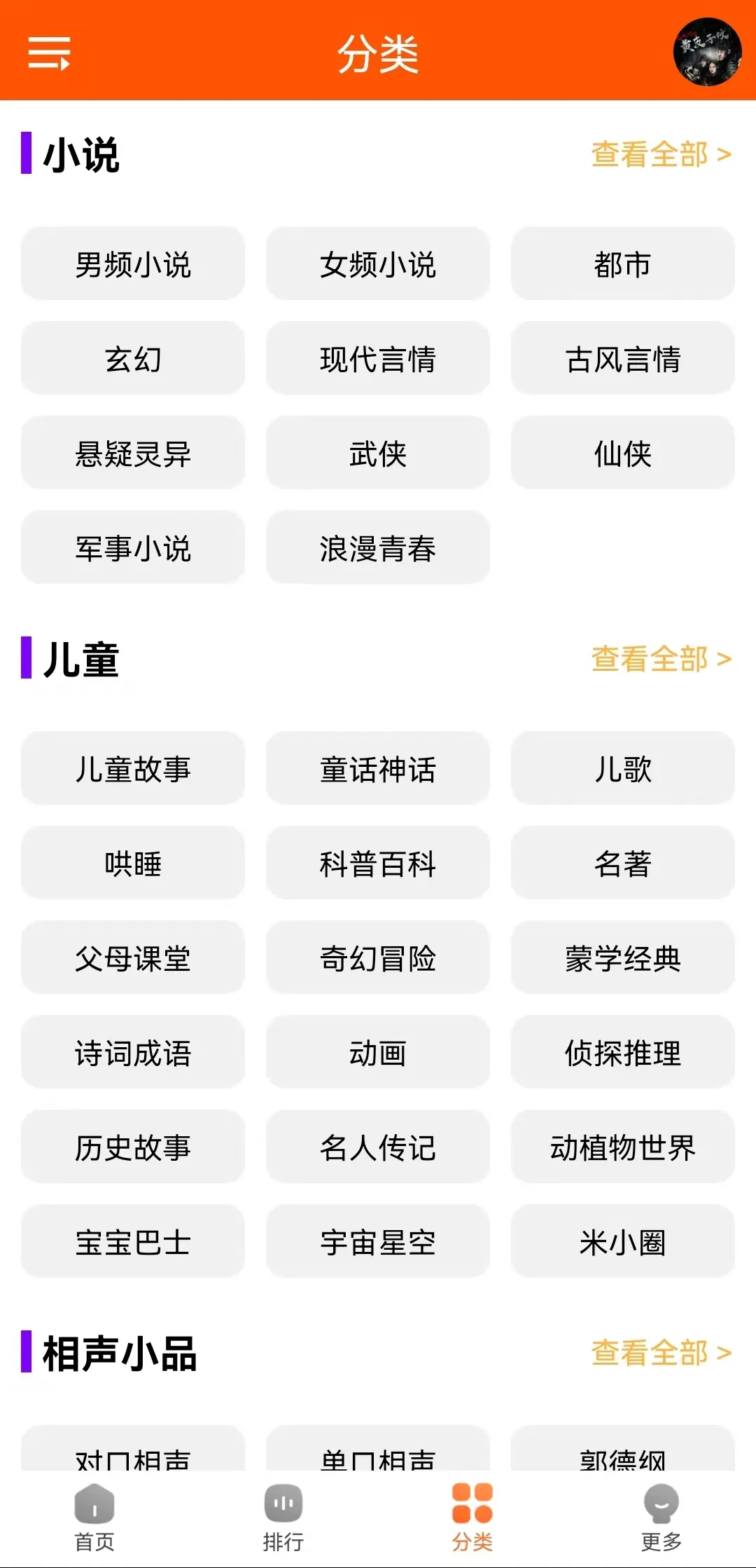 「分类」版块则是所有的资源分类区域,APP 分类得特别细致,小说、小品、评书、人文……每一大类又可以分成许多小类。