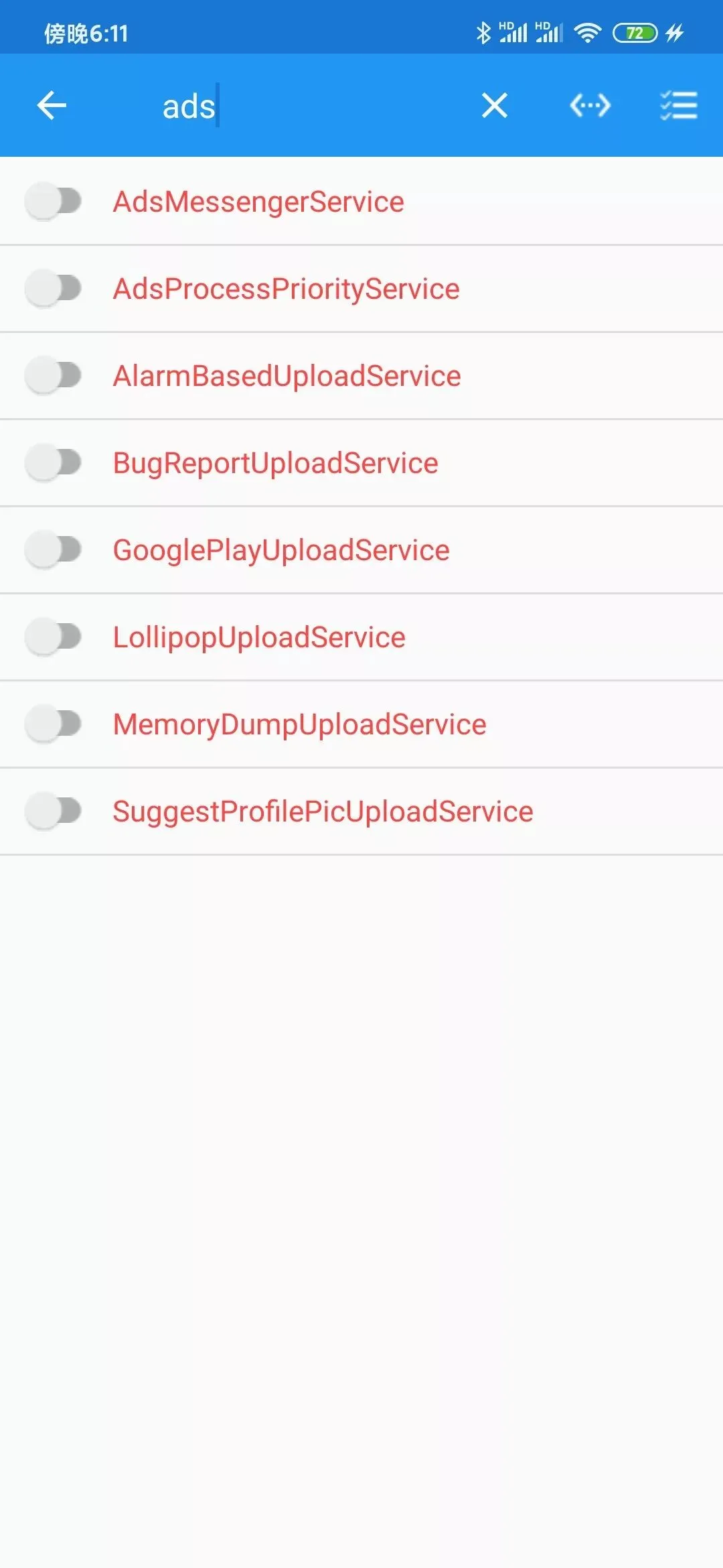 使用「My Android Tools」禁止APP广告推送,一般广告推送服务的名称为“Ads”我们只需要搜索这个关键词,然后把相关的服务都给关闭掉。