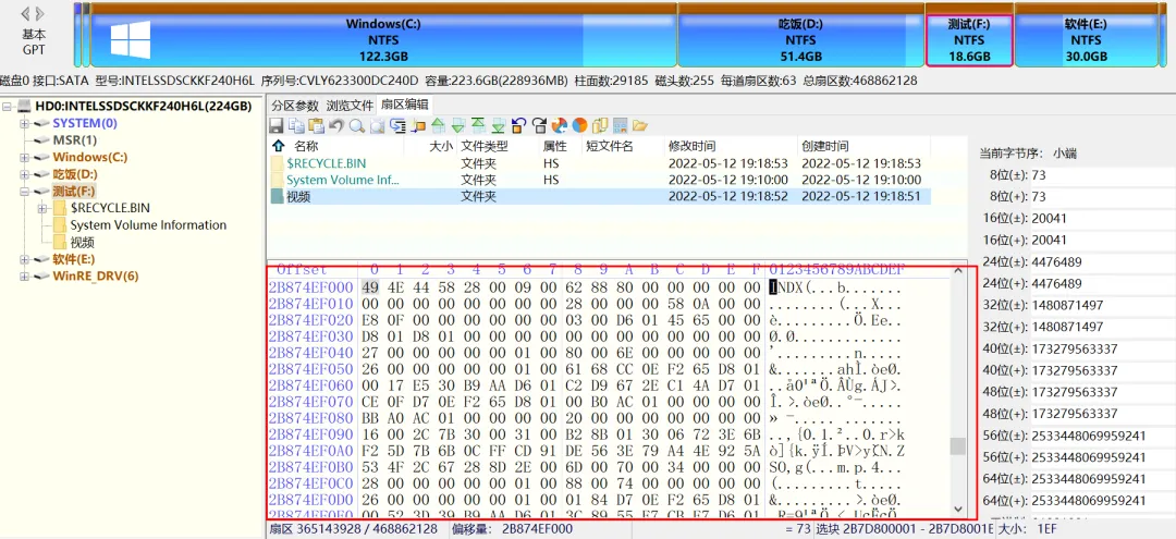 在拷贝了一些测试文件后,用 DiskGenius 看了一下 F 盘,确实有写入字节。