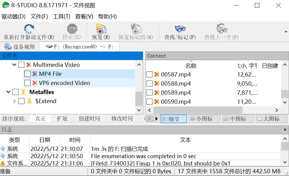 R-Studio 抢救了 10 张能正常打开的图片,以及 17 个能打开恢复的视频,其余不见踪影。