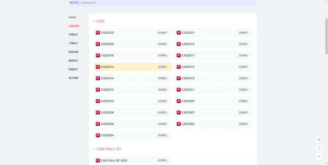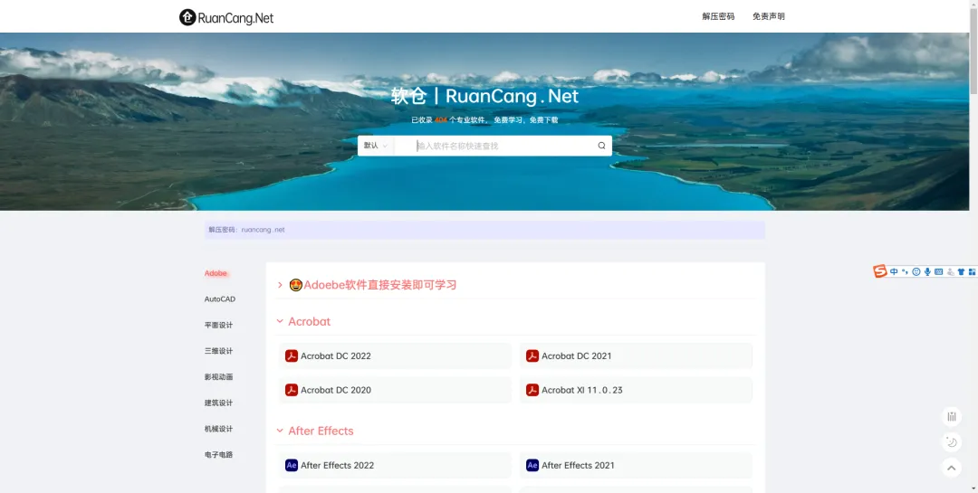 软仓是一款设计行业软件的聚集地,多达404套专业软件安装包,并且都是免费下载、免费学习,网站收录了Adobe、AutoCAD、平面设计、三维设计、影视动画、建筑设计、机械设计以及电子电路软件等设计辅助软件。