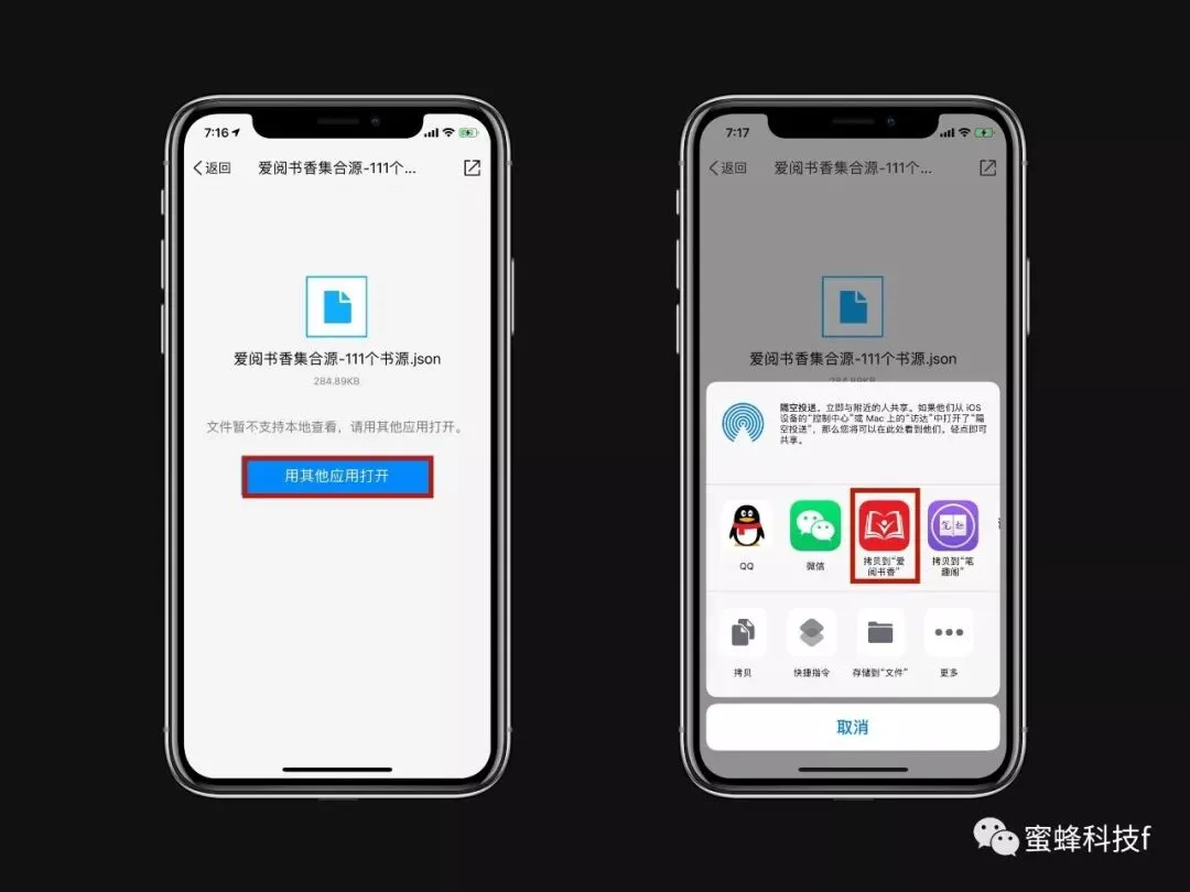 4、json/txt书源导入:把下载好的书源,通过手机QQ接收,然后【用其他应用打开】-【拷贝到‘爱阅书香’】