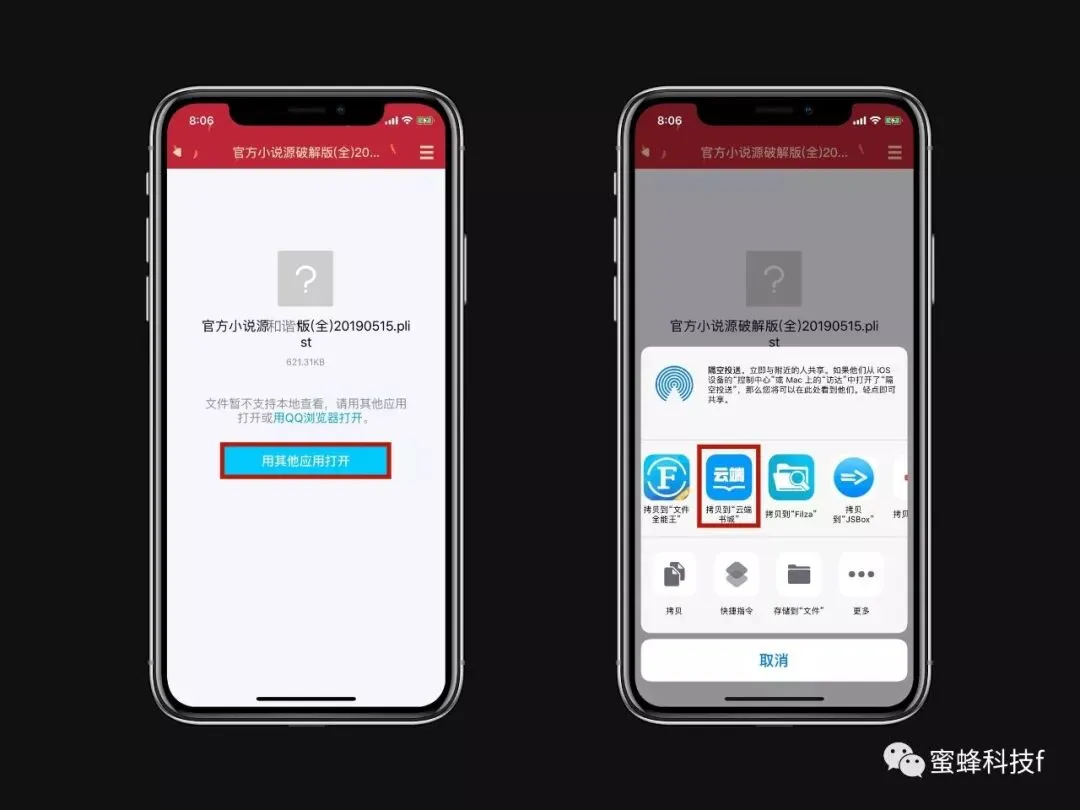 ④plist书源导入:把下载好的书源,通过手机QQ接收,然后【用其他应用打开】-【拷贝到‘云端书城’】