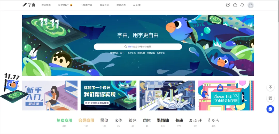 字由,一个拥有1754种字体的网站,其中有600多种是免费商用的。