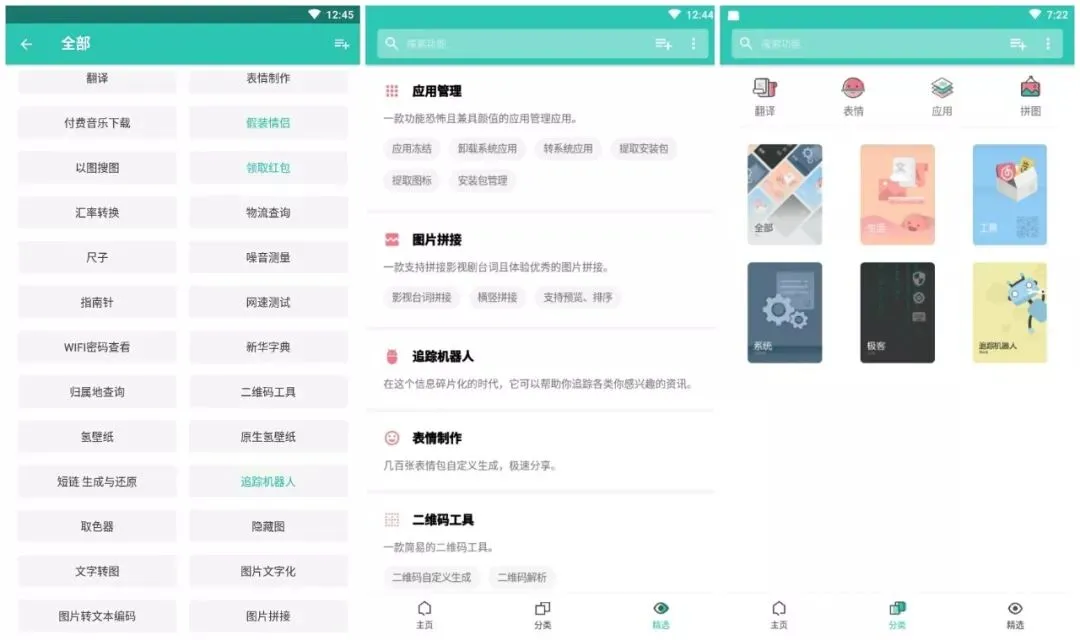 这是一个工具聚合类的APP,现在只有不到3M的大小,里面包含了几十个常用的工具,比如之二维码工具、氯壁纸、短链生成与还原、隐藏图、文字转图、图片文字化、图片拼接、GIF合成分解、带壳截图、QQ强制会话、磁力搜索、表情包制作、QQ付费音乐下载、尺子等等有趣而又实用的功能,部分需要用到ROOT权限,但是大部分功能都是不需要的,完全可以抛弃手机中一些不需要的软件,用一个木函来代替,相信我,使用它的时候你会如获至宝。