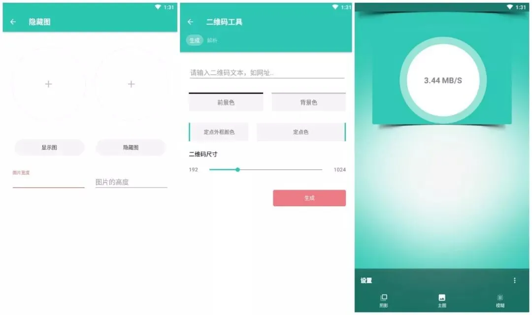 由于自己比较懒,氢壁纸的界面直接拿之前的网速测试图片了,氢壁纸大概的样式就是这样,上面一个横框,有阴影,然后底图是模糊的,当然可以自己设置,如果有好看的图能做出来非常美的氢壁纸,二维码工具就输入一些网址之类的信息,然后生成二维码,扫码即可进入,隐藏图可能大家不太清楚,好像是需要在某些APP才能查看,比如QQ,利用的是颜色的原理,直接查看隐藏图的时候可能是一个美女图片,当你点进去全屏的时候看到的可能就是个抠脚大汉,,,