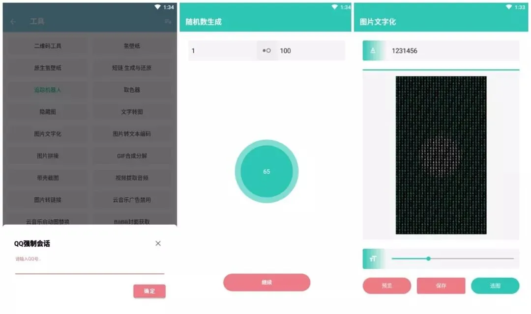 QQ强制会话是用来直接拉起和一个不是好友的人进行临时会话,适用于没加好友,但是能给他发消息,可以用于被女朋友拉黑。随机数生成就是生成一个随机数,可以用来跟别人比大小之类的,根据需要应用于不同的场合,图片文字转换我比较喜欢,比如说你有一张你女朋友的照片,然后打上他的名字,软件自动用女朋友的名字组合在一起生成她的照片,非常的棒(最后给出了丫丫的照片用作演示)。