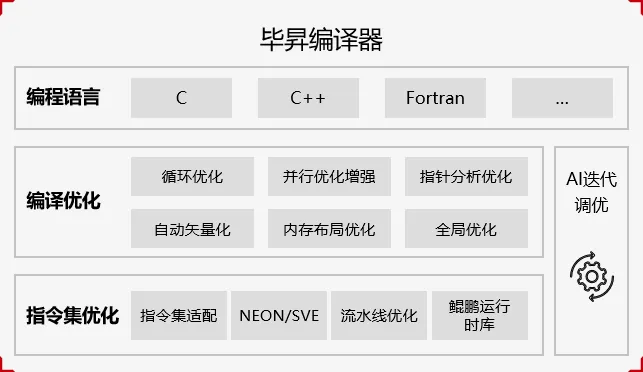 毕昇编译器于 2021 年 12 月 30 日发布 2.1.0 版本,当前版本增强循环优化、结构体重组优化、Block reorder 优化特性,提升 SPEC CPU 2017 多个子项及 HPC workload 的性能;新增支持 pow 初始化立即数拟合、数学函数控制等精度控制选项,进一步增强精度调优选项;支持多线程并行编程技术和 Input/output enhancements (Fortran 2003)/ 异步 IO 特性,满足鲲鹏场景对 Fortran 语言生态的需求。