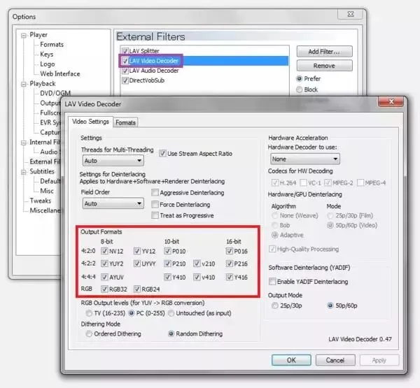 MPC-HC最为人称赞的一点,在于其极强的可玩性,这令它能外挂大量滤镜,获得最顶级的解码能力。MPC-HC使用的是DirectShow架构,在这个架构之中,MPC-HC可以通过Win系统提供的DirectShow接口,来调用各种解码器。例如,MPC能够封装ffdshow等DirectShow滤镜,而神级滤镜LAV的出现,更是让MPC的视频解码近乎无敌。