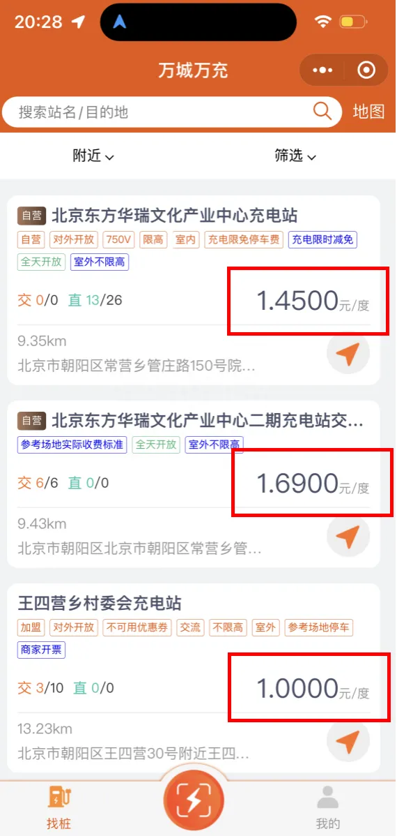 车主:就同一品牌的充电站,不同地区的电价也是不一样的。比如我们家附近的,北四环附近有两个充电站,价格也是不一样的。