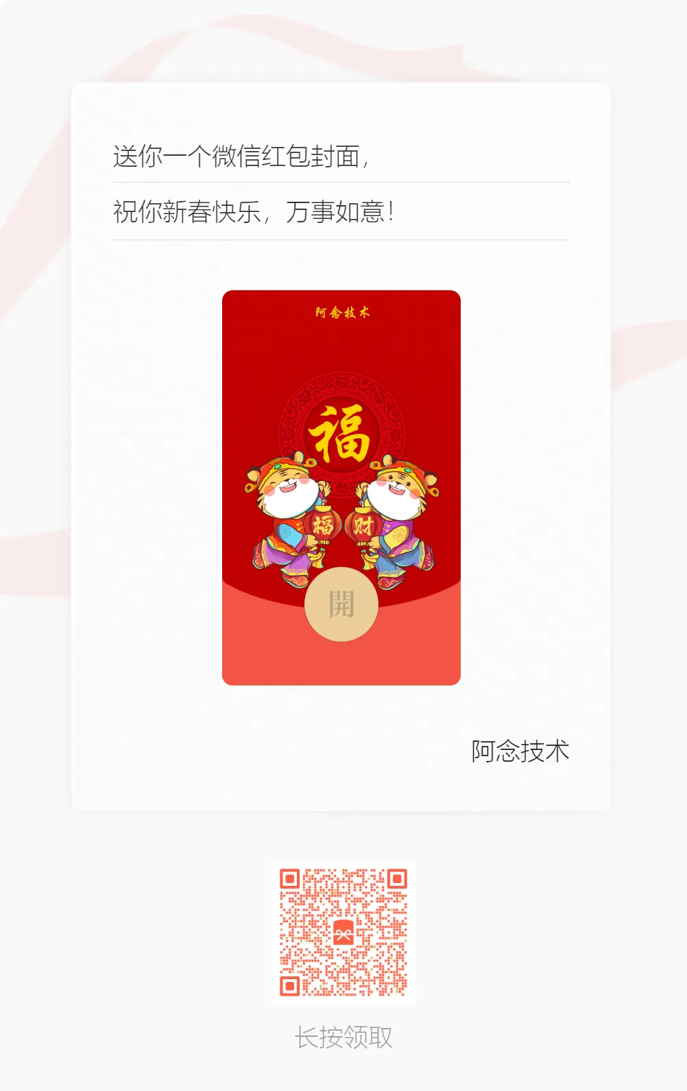 阿念技术定制红包封面,1元/个,我定制了1000个,长按下图二维码领取封面,完全免费,谢谢粉丝朋友们的支持,小小福利,不成敬意。