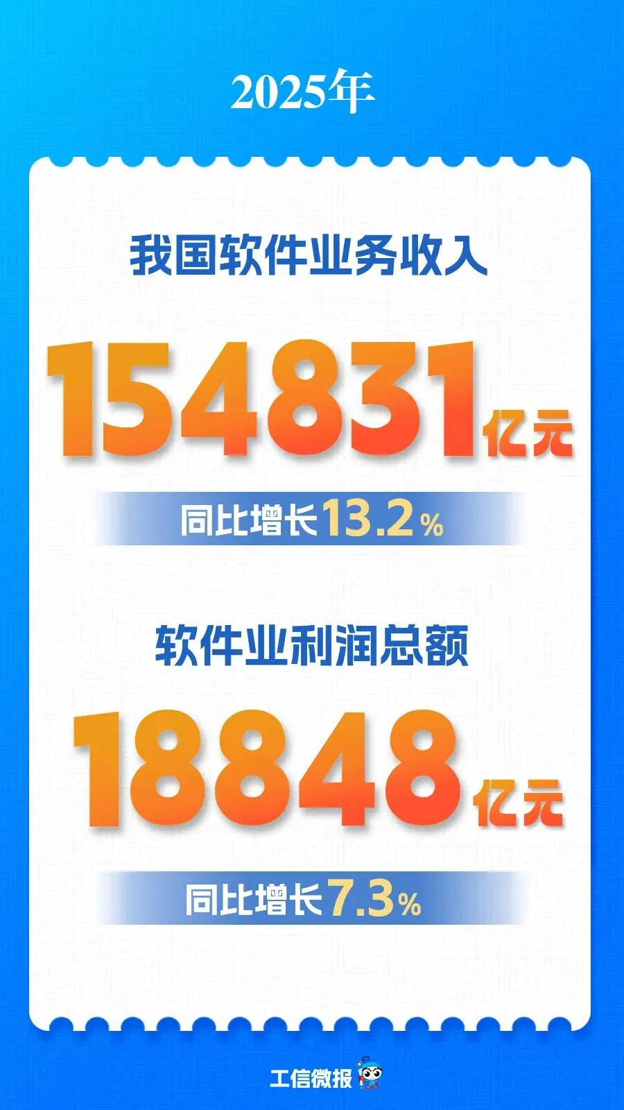 【行业资讯】2025年我国软件业务收入154831亿元 同比增长13.2%