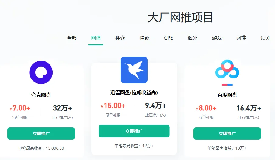其优势在于项目分类清晰,支持按佣金、结算方式、推广形式等条件快速筛选,适合同时操作多个项目、追求执行效率的推广员。