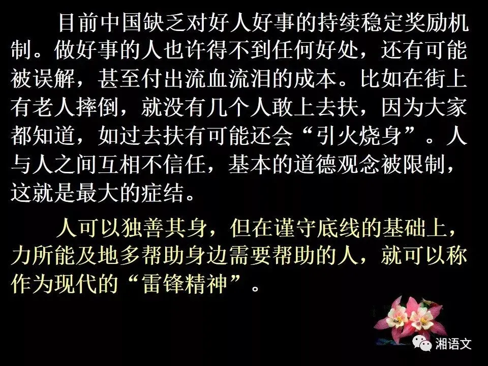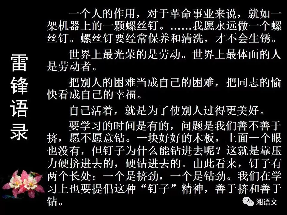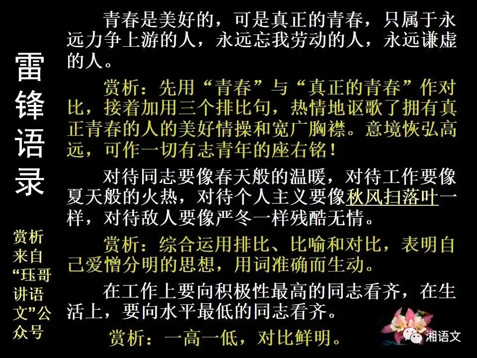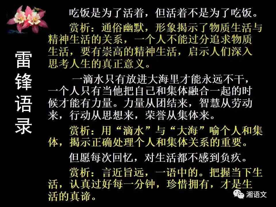 赏析:通俗幽默,形象揭示了物质生活与精神生活的关系,一个人不能过分追求物质生活,要有崇高的精神生活,启示人们深入思考人生的真正意义。此句并非雷锋首创,但因雷锋而更深入人心。