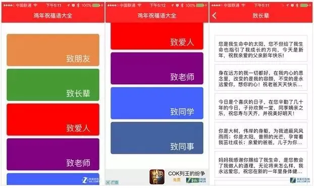 这应用的界面可以说非常简陋,但是也最直接,就是将拜年短信分成了:致朋友、致长辈、致爱人、致老师、致同学、致同事,这几类。