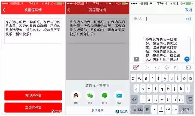 点击分类就能看到对应的拜年短信,选择之后可以选择几种方式发送,支持短信、QQ、微信、邮件,当然也可以直接复制。