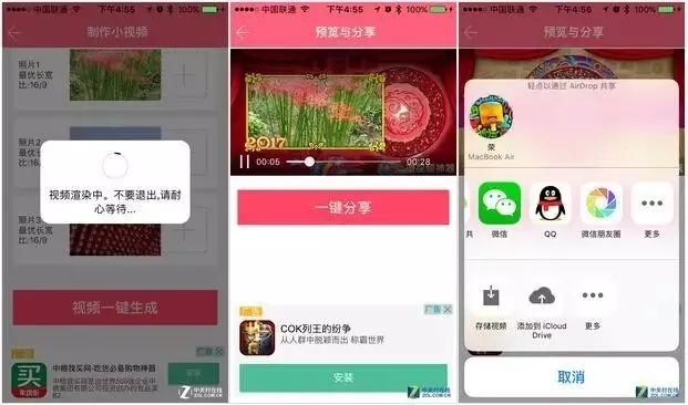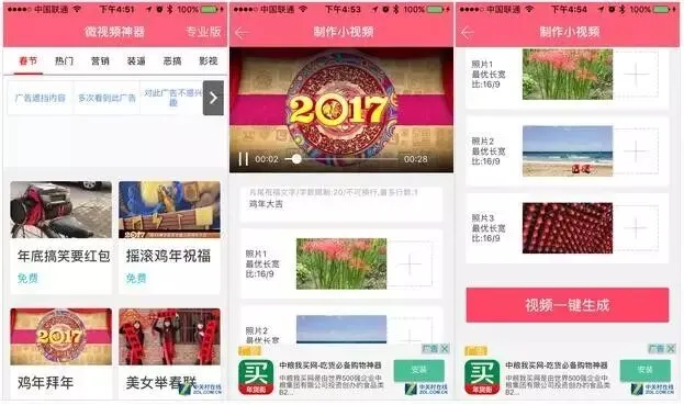 这个名为“微视频神器”的应用在春节期间也推出了相应的版本,内置了一些春节拜年的视频模板,在此基础上用户可以添加一些祝福的话和照片上去,生成新的视频。
