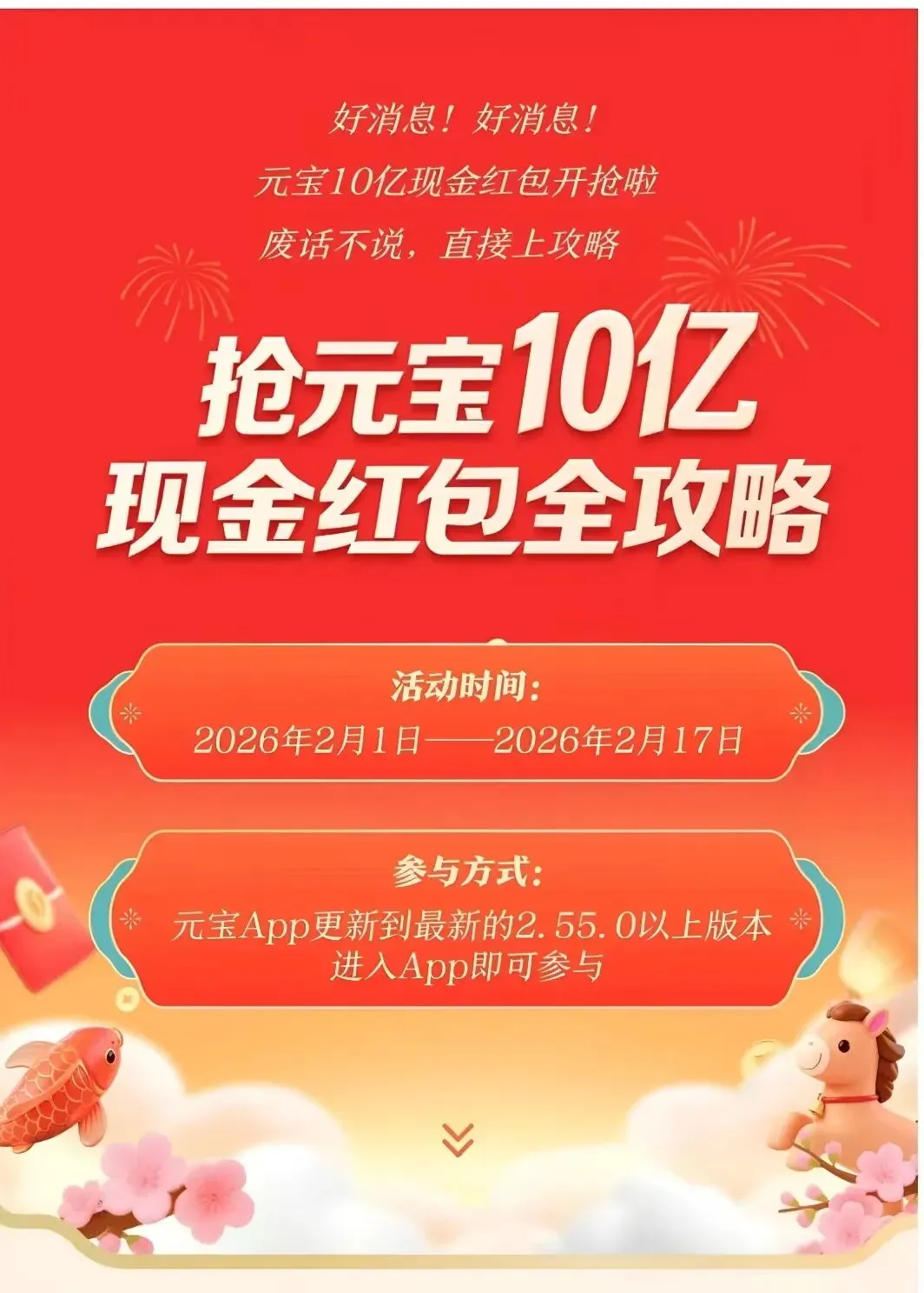 温馨提示:本文仅为活动攻略分享,活动规则以元宝App官方为准,如有变动请以官方通知为准。祝大家马年暴富,红包拿到手软!