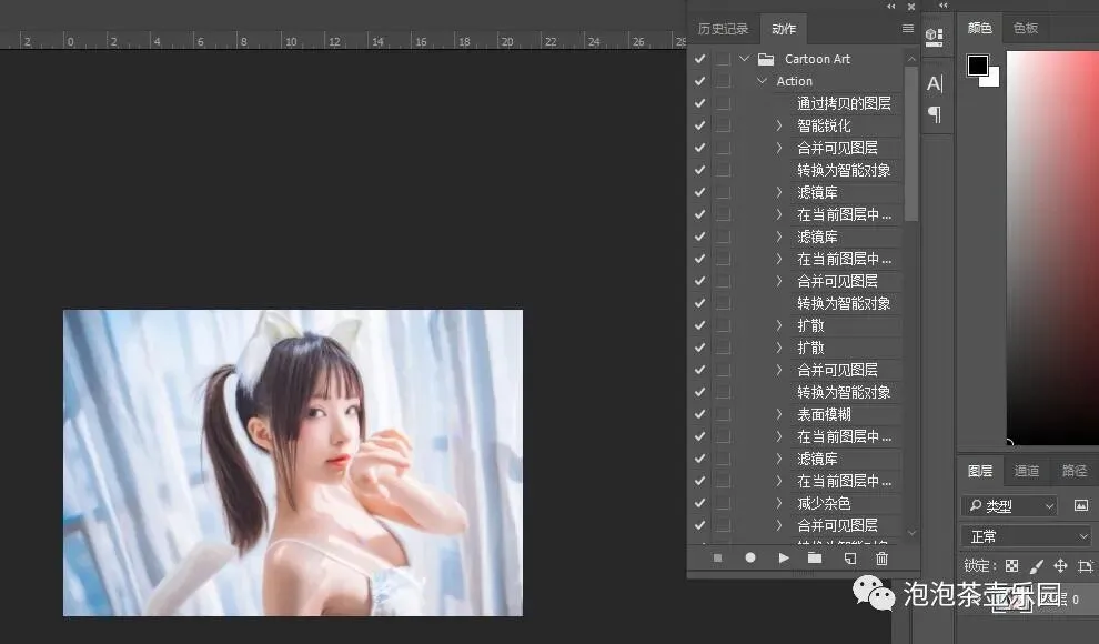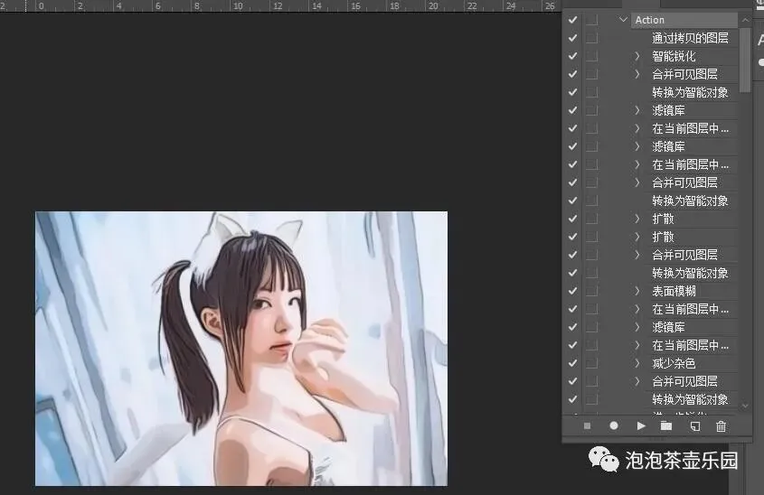 打开一张照片,点选一个动作运行即可生成漫画图。(这时候photoshop会照着动作一步一步自动处理图片,达到想要的效果。)