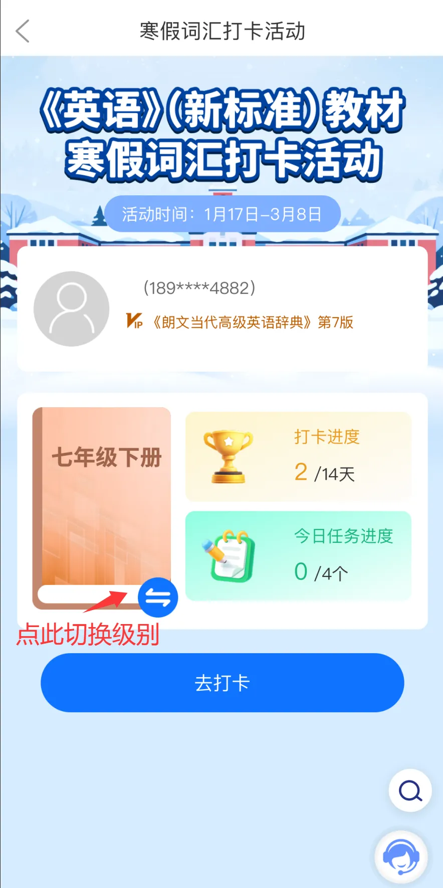默认的打卡级别与报名时填写的级别一致,如需修改,可自行切换,切换后已打卡天数不受影响,但会清空当日任务进度与之前学习的记录,因此,如已经开始打卡,请谨慎操作哦。