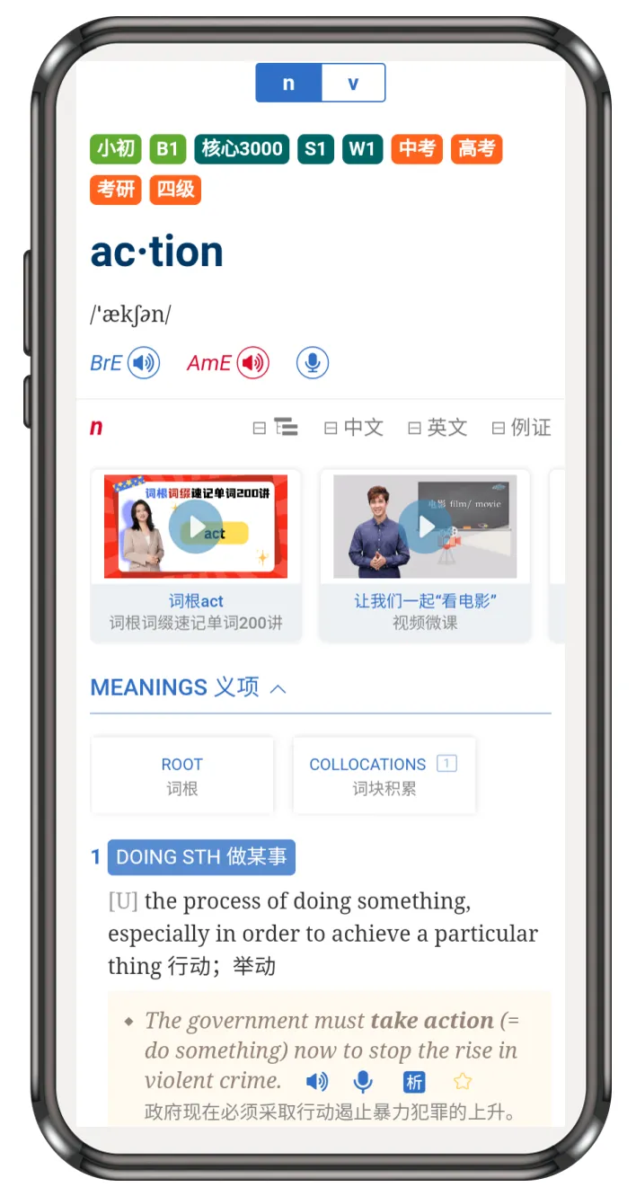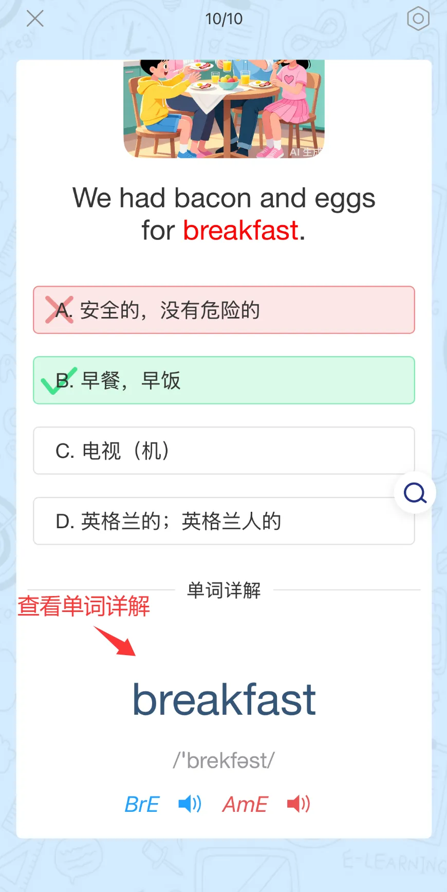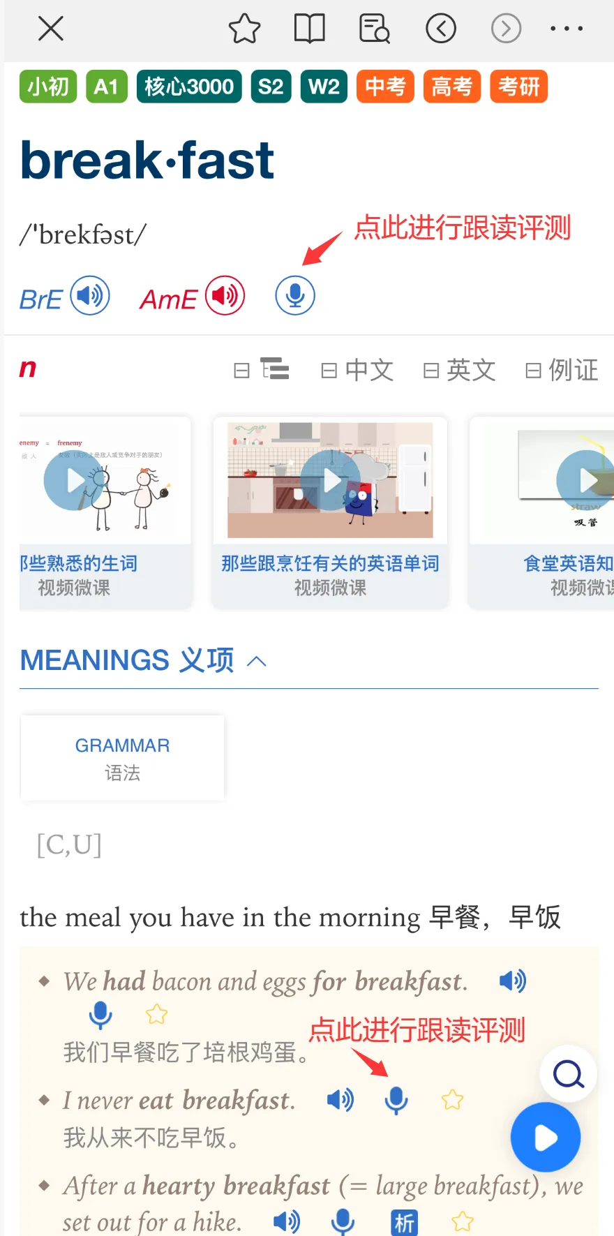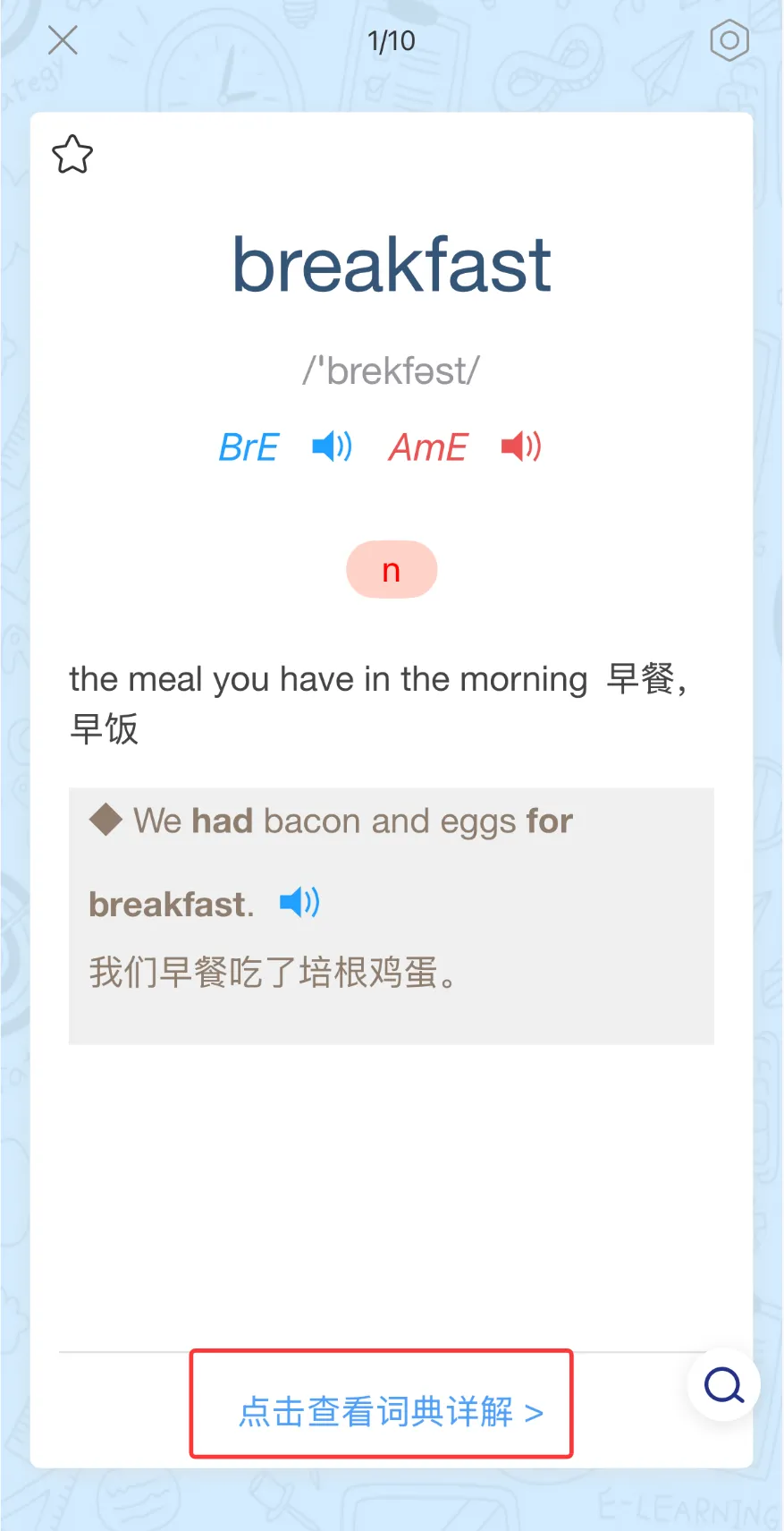 在单词卡页面进行学习时,如果想进一步学习,可点击下方的“点击查看词典详解”,即可跳转到朗7词典中的详情页,深入学习这个单词在词典中的全部内容,还可进行跟读评测。