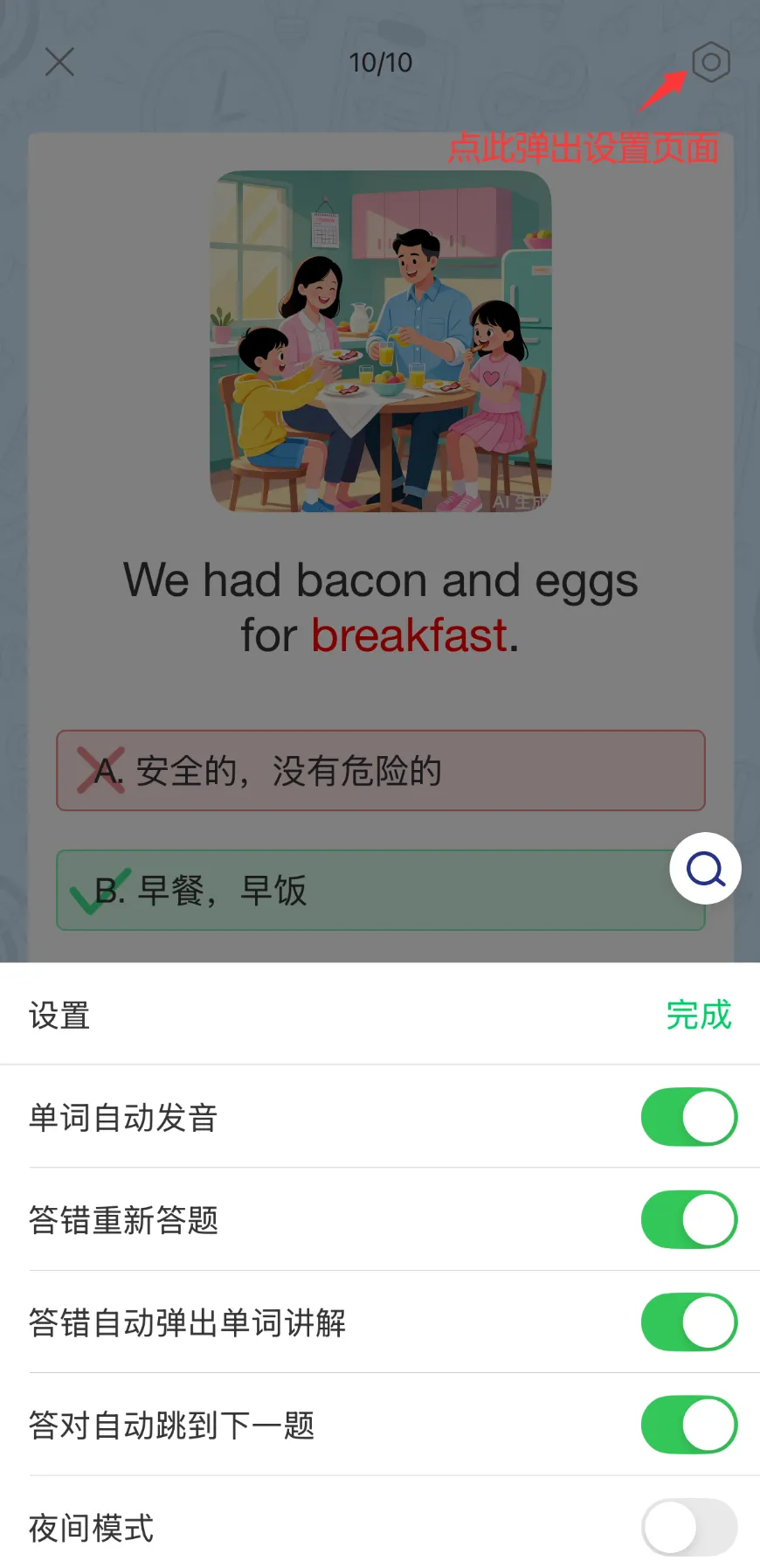 做题过程中可以点击右上角的按钮根据需要调整相关设置。每做完一道题,也可在下方再次查看单词卡或跳转至词典详情页,巩固记忆。