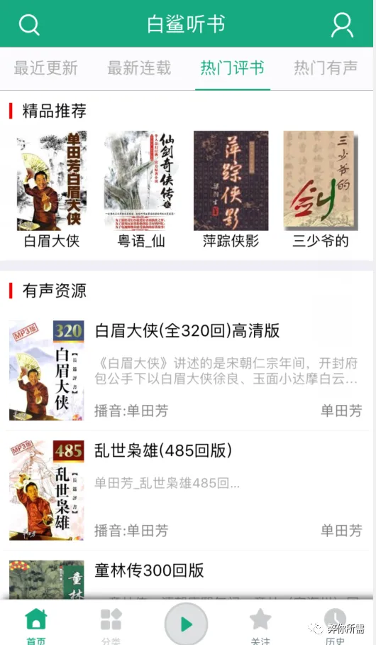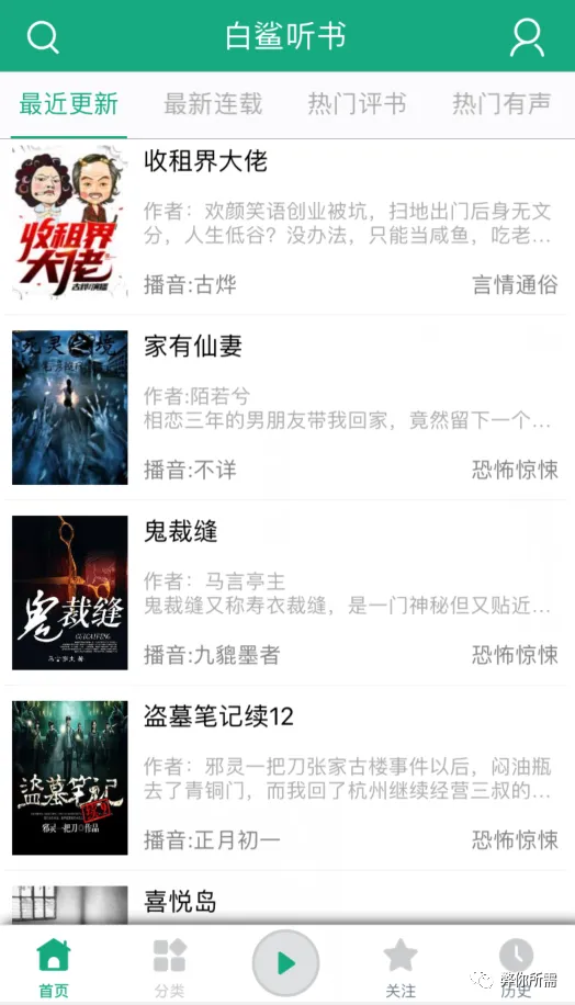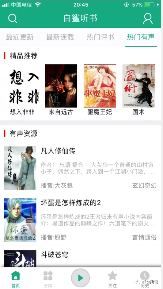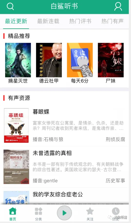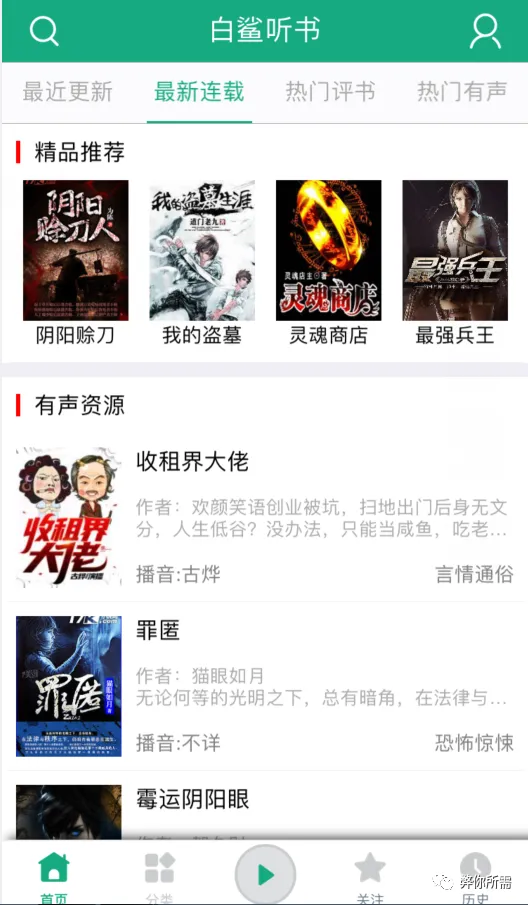 app首页把资源分为了:最近更新、最新连载、热门评书、热门有声这四个类别,大家可以在里面找到很多最新、最热、最流行的有声小说、有声读物等等,