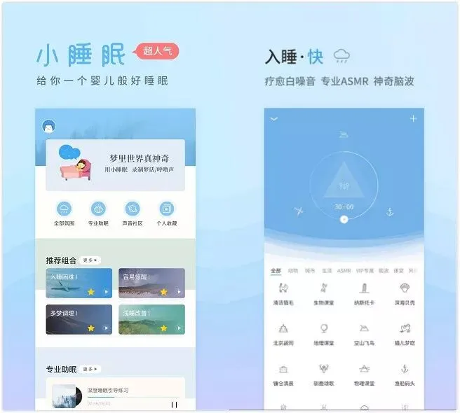 是一款专注于帮助人们进入睡眠的应用,功能齐全,效果明显,让你从此摆脱失眠烦恼。压力大、焦虑、难入睡的小伙伴可以试试,提供助眠、睡眠监测等,帮你睡的更香,在睡眠管理的基础上,小睡眠超棒氛围音还是提高工作、学习效率的好帮手。