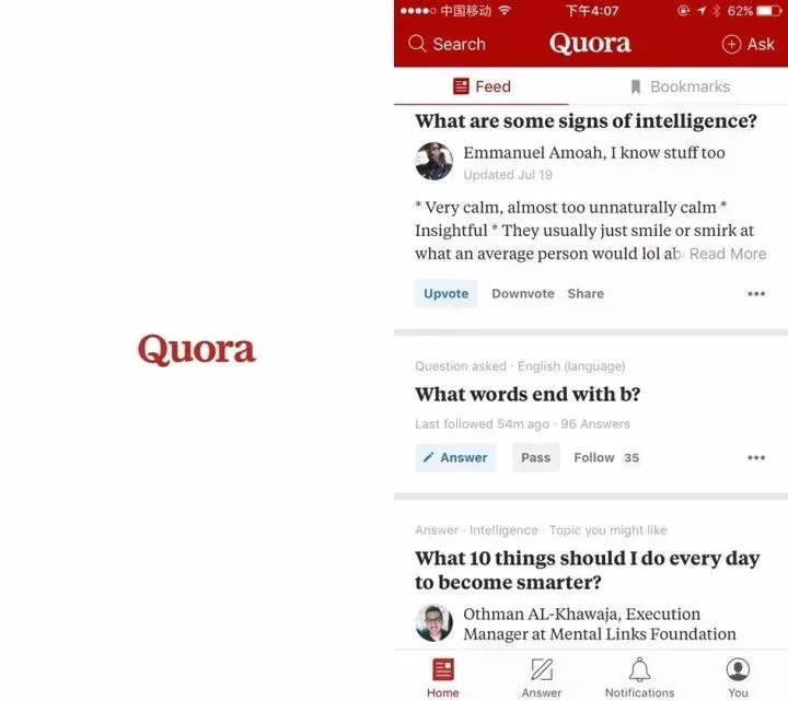 也是类知乎的问答社区,全英文app,和知乎比,少了很多鸡汤和撕逼。同一个问题,你能看到美国人、英国人、澳大利人等等国家的答案,不只听一家之言,对培养独立思考的习惯有帮助。
