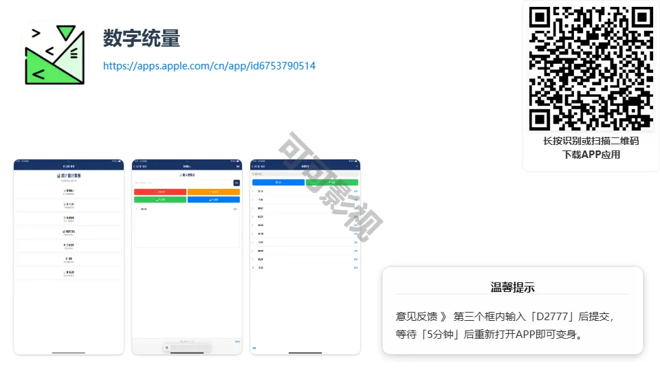 下载链接:数字统量 https://apps.apple.com/cn/app/id6753790514推荐指数:★★★★☆变身方法:意见反馈 》 第三个框内输入「D2777」后提交,等待「5分钟」后重新打开APP即可变身。应用简评:不支持弹幕/小窗/缓存功能,更新速度快,建议选择默认靠前的高清线路