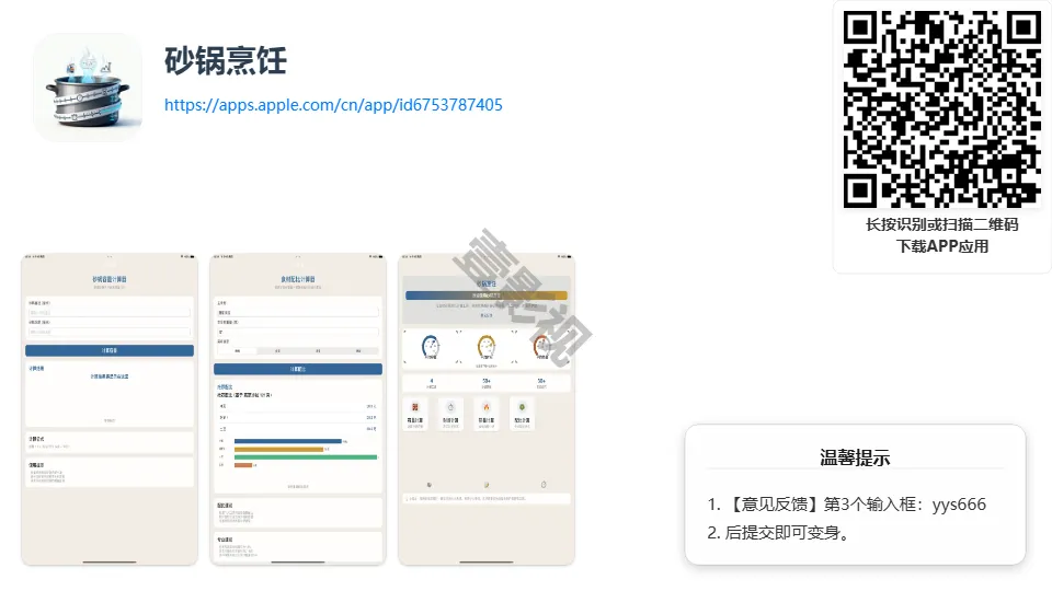 下载链接:砂锅烹饪 https://apps.apple.com/cn/app/id6753787405