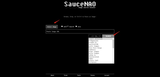 点击“Select image”添加图片,再点击“Search”即可。还可以事先选择结果内容类型,是漫画、电影还是电视剧等等。