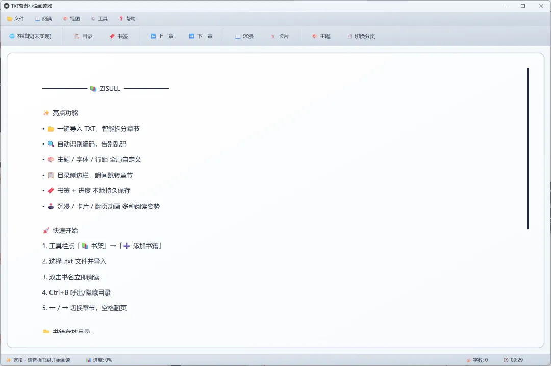 这是一款专门用于 PC 端的小说阅读工具,软件是绿色单文件版本,不用安装,双击图标就能直接打开使用。