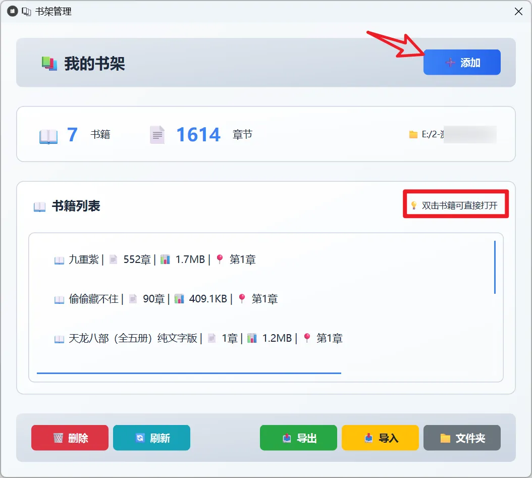 在书架管理页面里,有两种方式可以操作:既可以单独添加新的书籍,也能直接双击书籍列表里已有的书,快速打开阅读。
