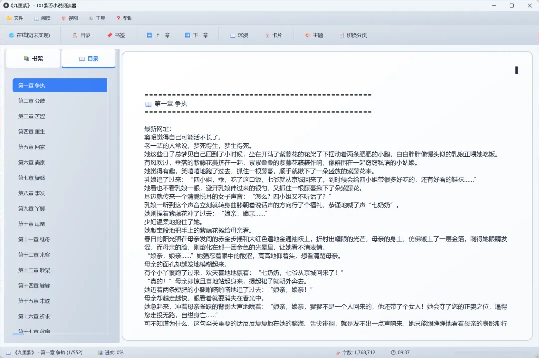 它的阅读界面设计得很不错,整体风格清新又简洁,看起来很舒服。界面布局也很清晰,左边显示小说的章节列表,右边就是具体的阅读内容。