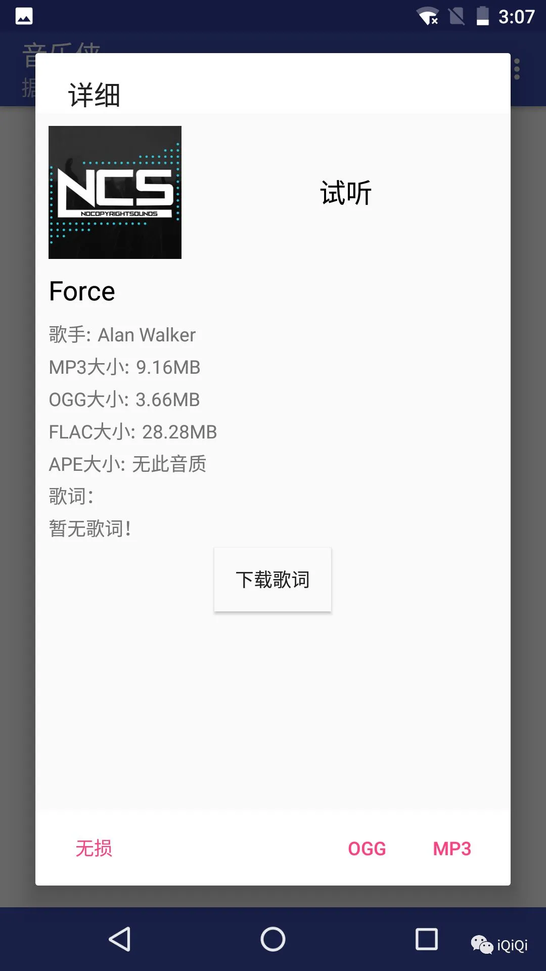 我们直接点击音乐名称后将会出现一个详细信息弹窗,如果音乐找到相关资源的话便会显示无损、OGG、MP3,我们根据需要点击文字即可下载。