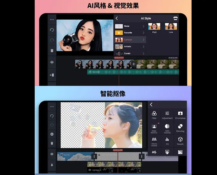 Kinemaster是一款功能强大的安卓短视频剪辑工具,可用于剪辑和制作高质量的短视频。它提供了多种视频剪辑和润色工具,例如音频混合、图层分解、特效添加等,同时还支持导入和输出4K视频;